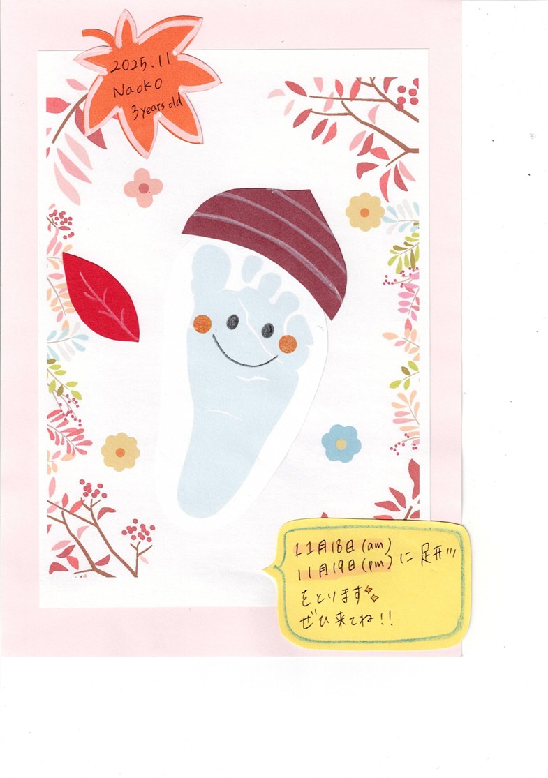 可愛い足形が取れますので、是非お気軽にお越しください!